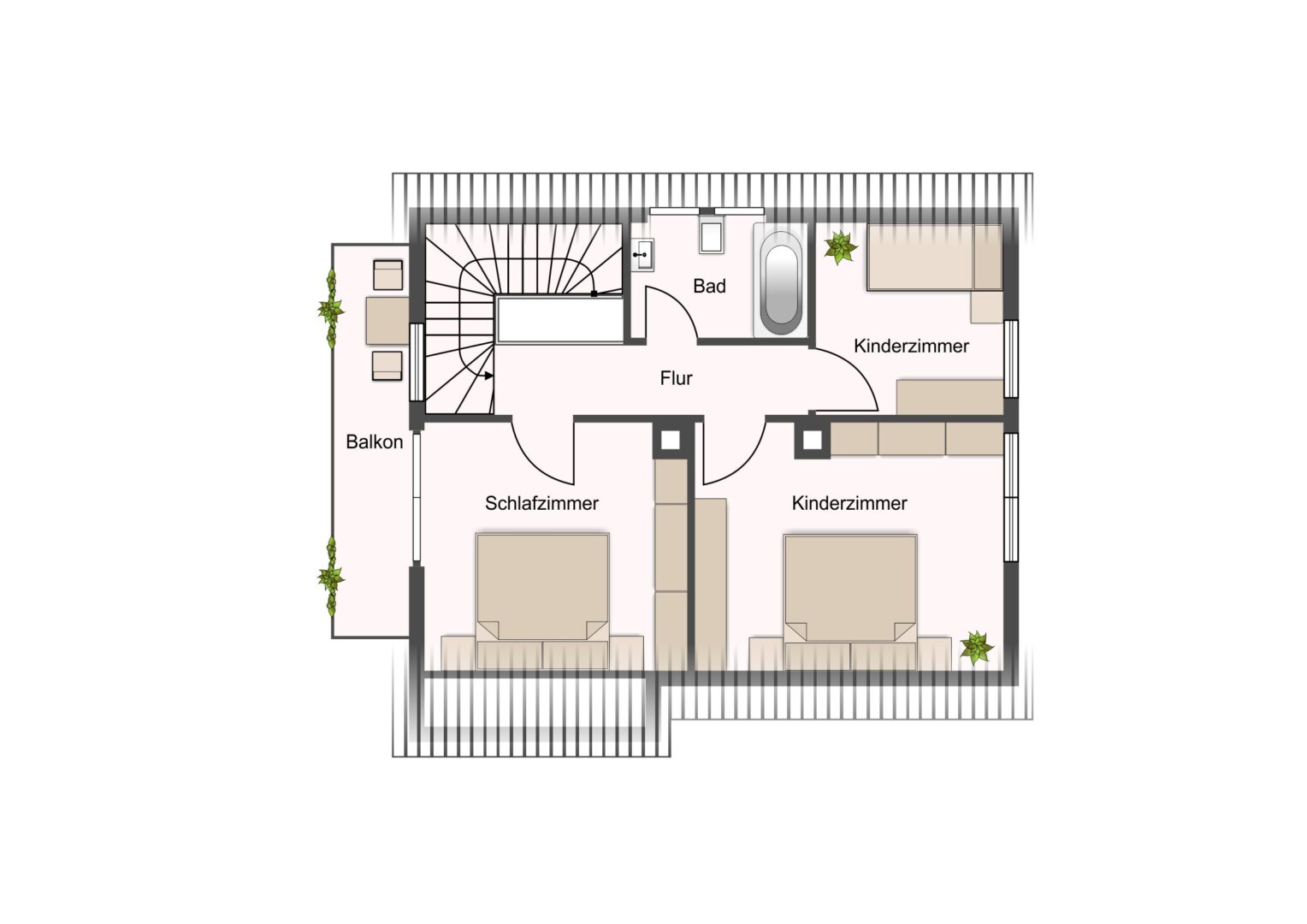 Im Obergeschoss befinden sich drei weitere Zimmer, die flexibel als Schlaf-, Kinder- oder Arbeitszimmer genutzt werden können. Zudem gibt es hier ein Badezimmer sowie einen Balkon, der vom angrenzenden Schlafzimmer aus begehbar ist und den Blick in den Garten eröffnet.