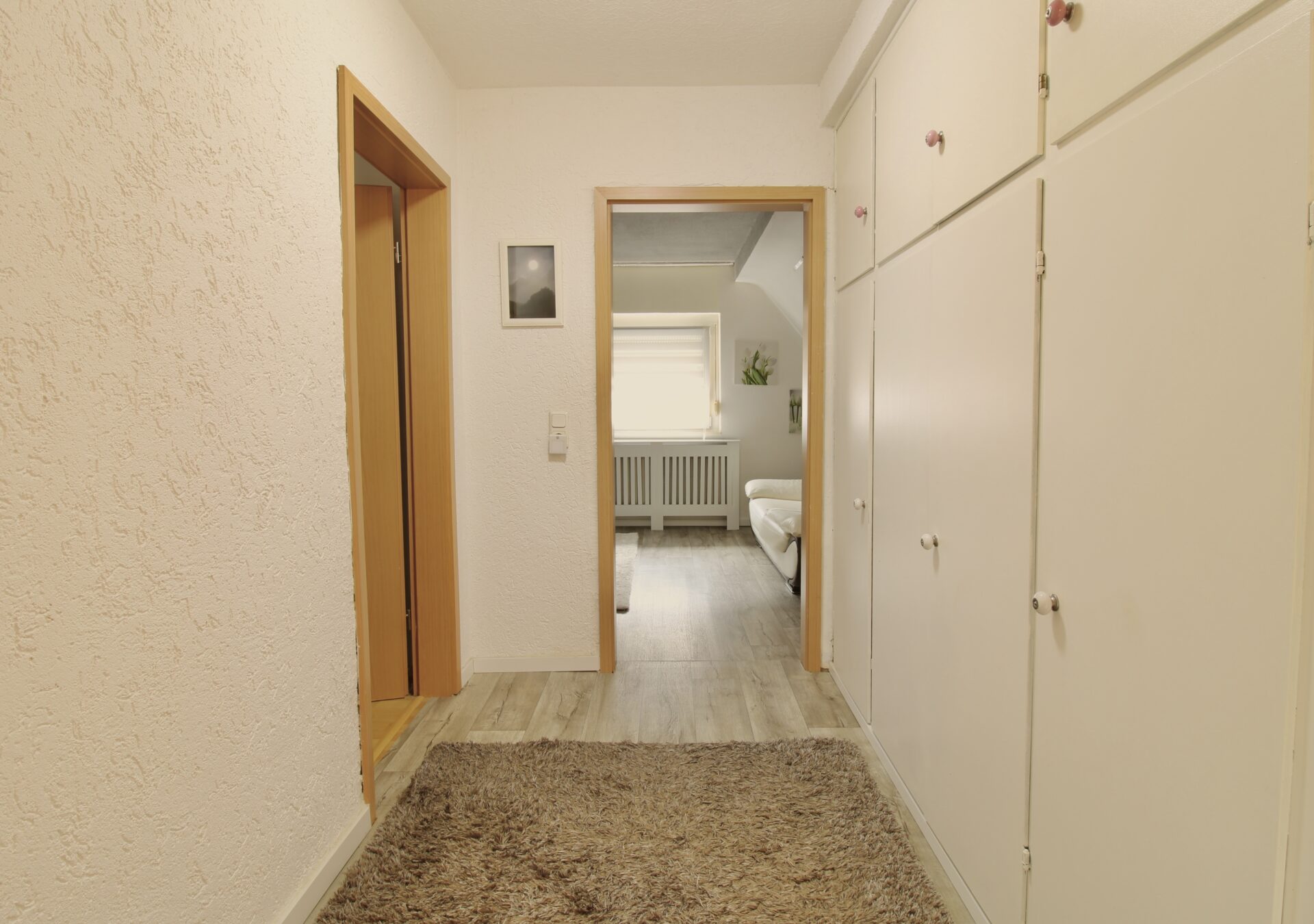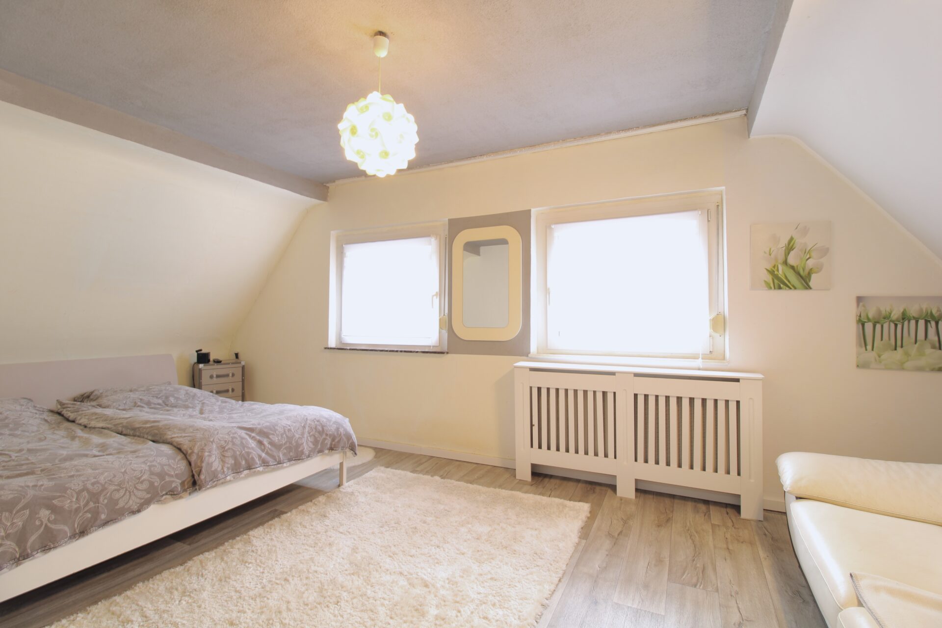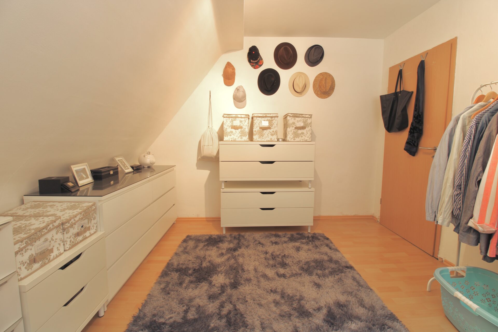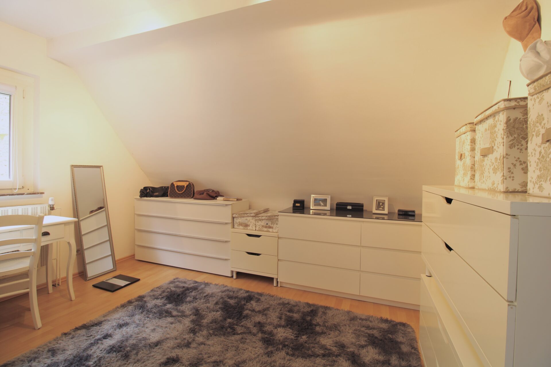 Das Dachgeschoss überzeugt mit einem großen Schlafzimmer, einem separaten Ankleidezimmer und einem praktischen Einbauschrank im Flur. Zudem bietet das Dachgeschoss Zugang zu einem Balkon, welcher nach Belieben ausgebaut werden kann – Geländer und Bodenbelag müssen noch ergänzt werden.