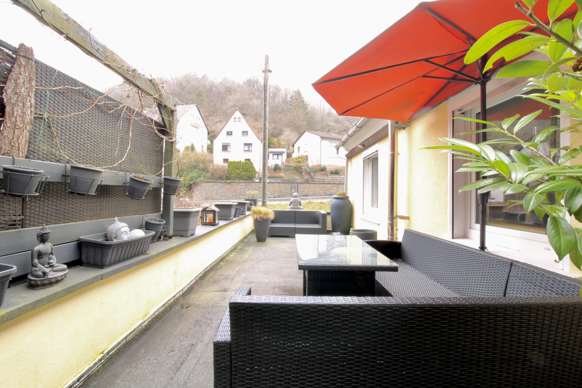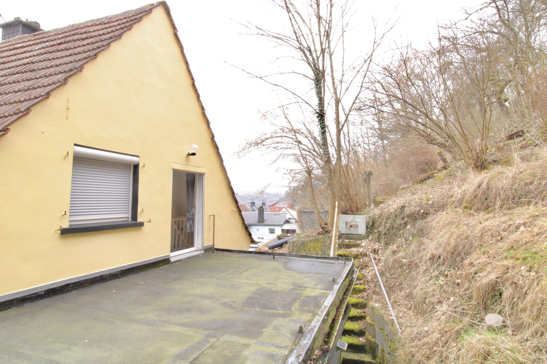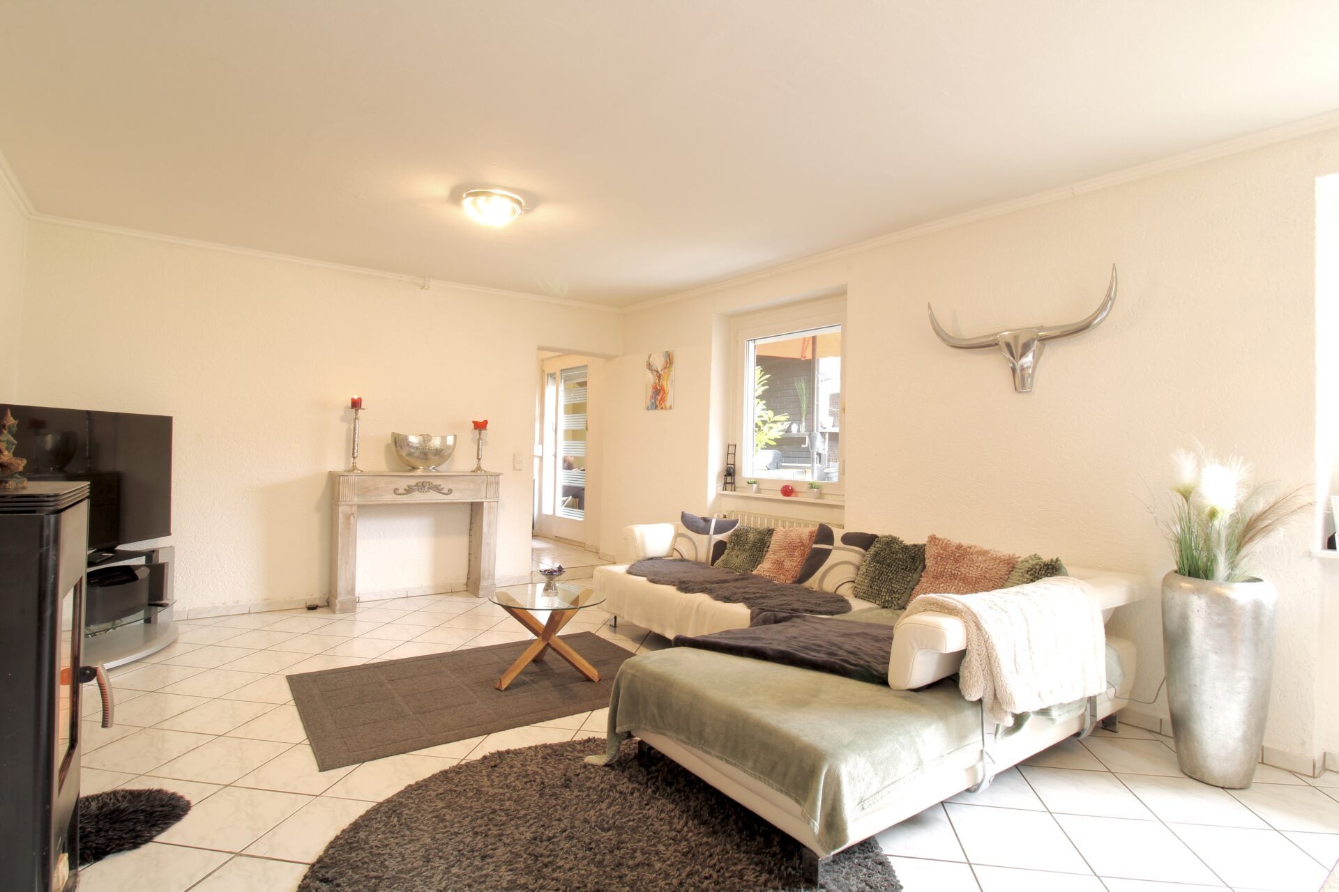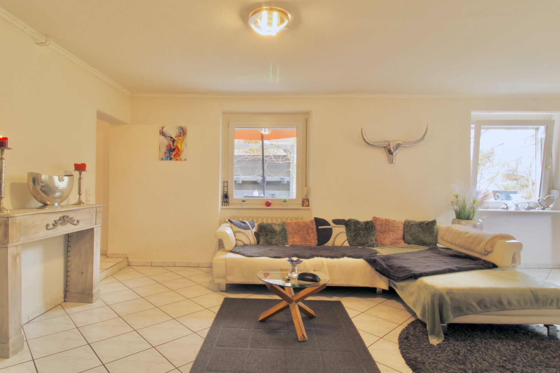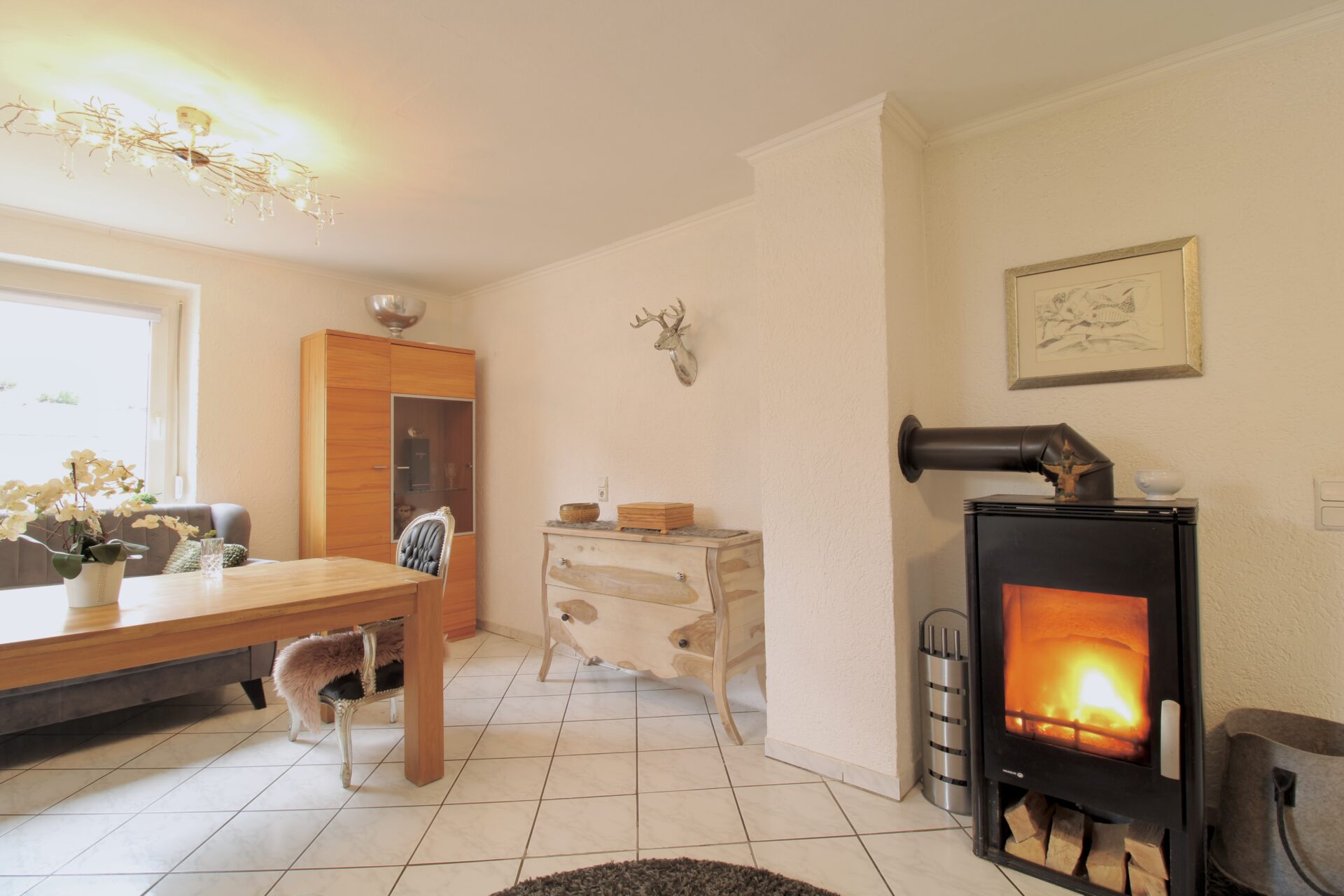Über die Treppe ins Obergeschoss gelangen Sie in den Hauptwohnbereich des Hauses. Hier erwartet Sie ein offenes und großzügiges Wohnzimmer mit Kamin, das eine warme und einladende Atmosphäre schafft. Vom Wohnzimmer aus führt der Weg weiter in ein Büro, von dem Sie Zugang zur großen, teilüberdachten Terrasse haben – perfekt für gemütliche Stunden im Freien. Ebenfalls auf dieser Etage befindet sich ein Badezimmer sowie ein separates Gäste-WC zwischen Erd- und Obergeschoss.