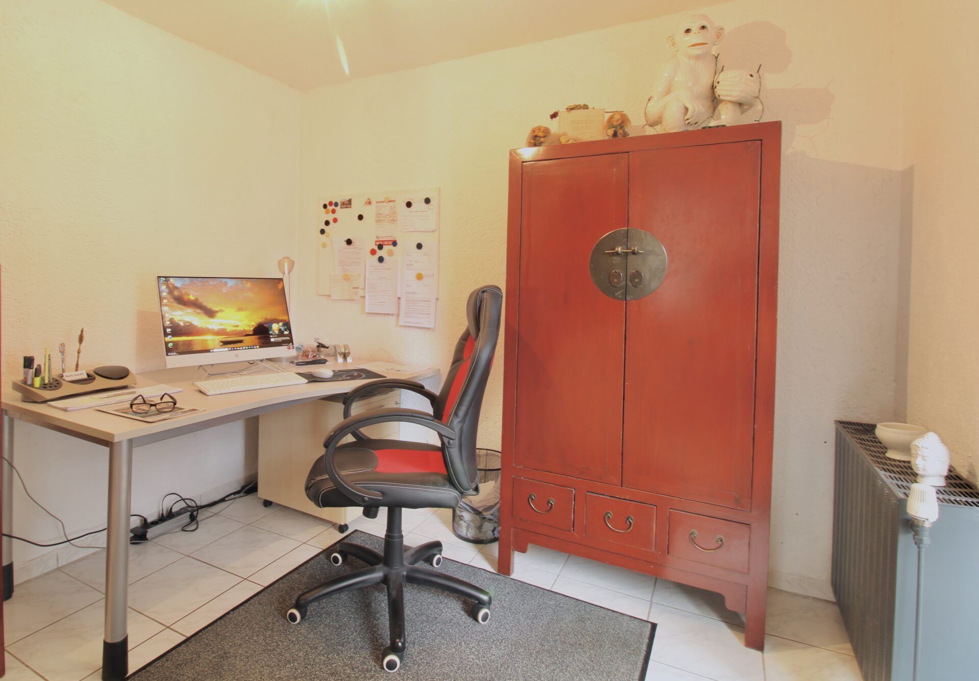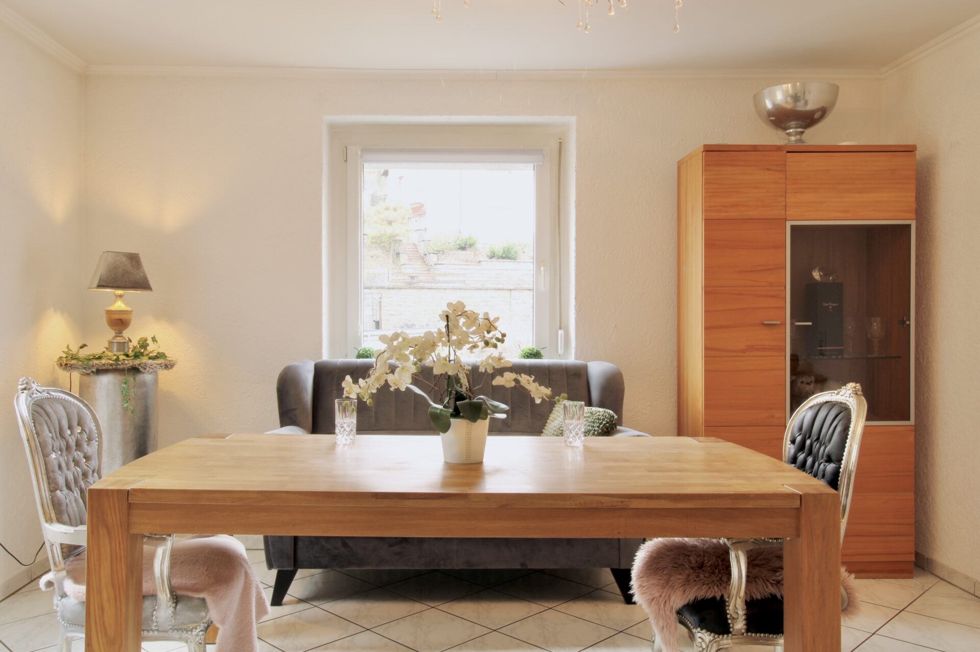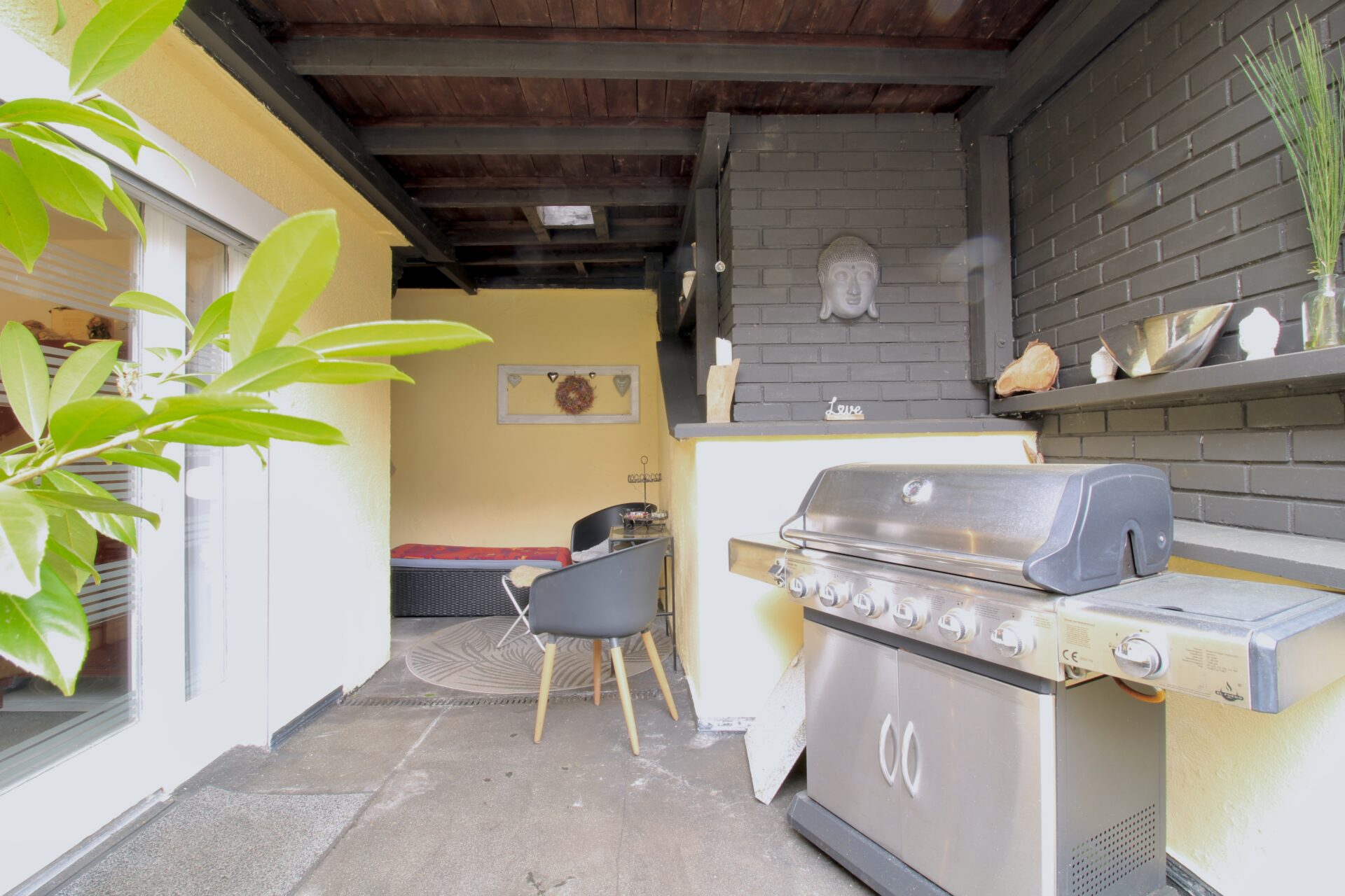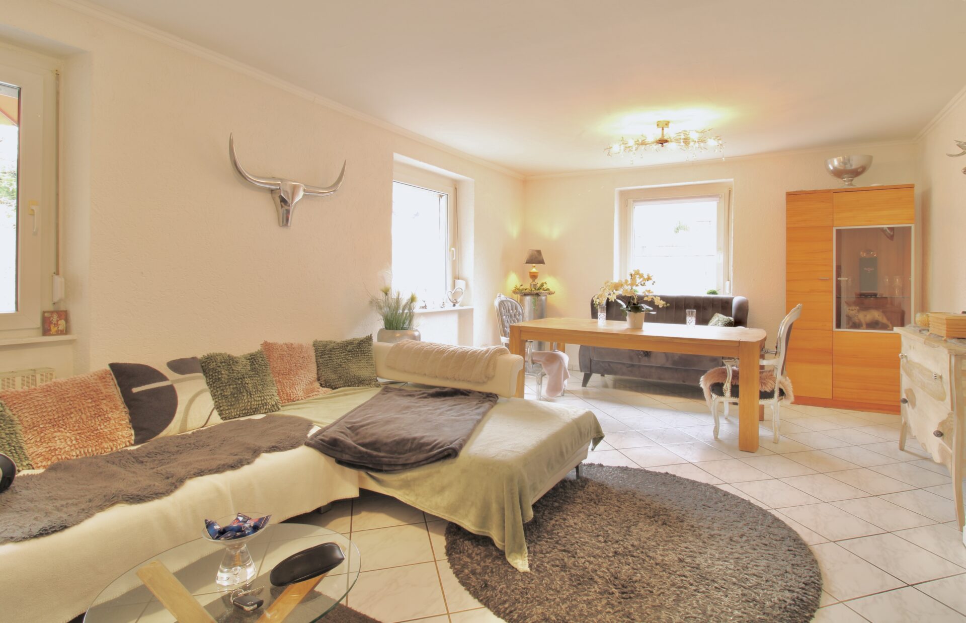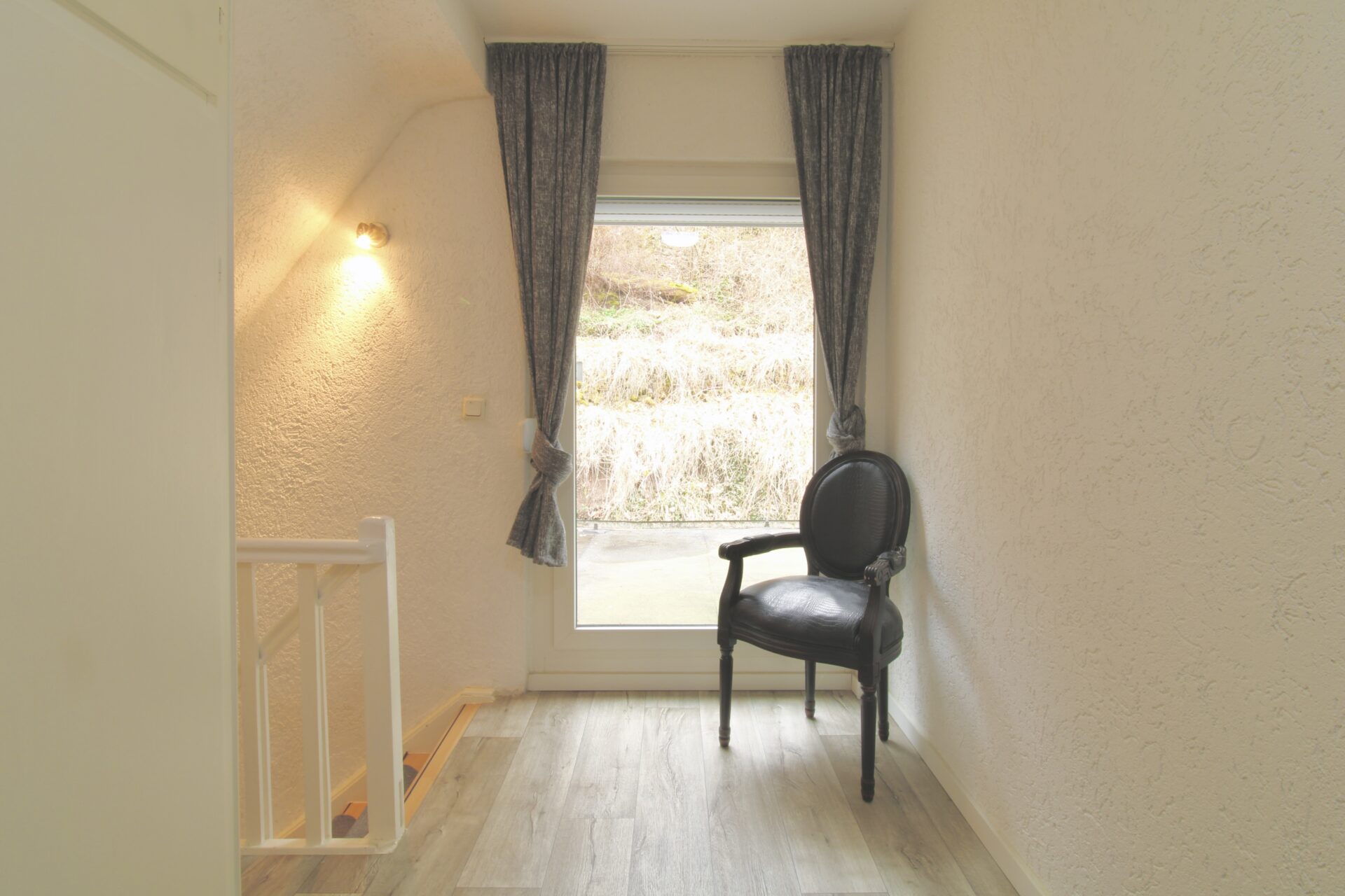 Über die Treppe ins Obergeschoss gelangen Sie in den Hauptwohnbereich des Hauses. Hier erwartet Sie ein offenes und großzügiges Wohnzimmer mit Kamin, das eine warme und einladende Atmosphäre schafft. Vom Wohnzimmer aus führt der Weg weiter in ein Büro, von dem Sie Zugang zur großen, teilüberdachten Terrasse haben – perfekt für gemütliche Stunden im Freien. Ebenfalls auf dieser Etage befindet sich ein Badezimmer sowie ein separates Gäste-WC zwischen Erd- und Obergeschoss.