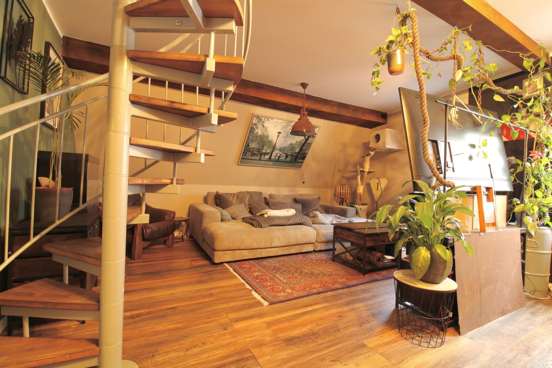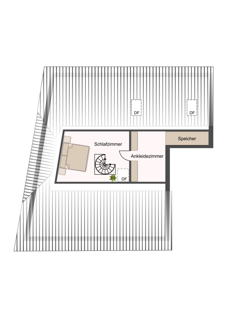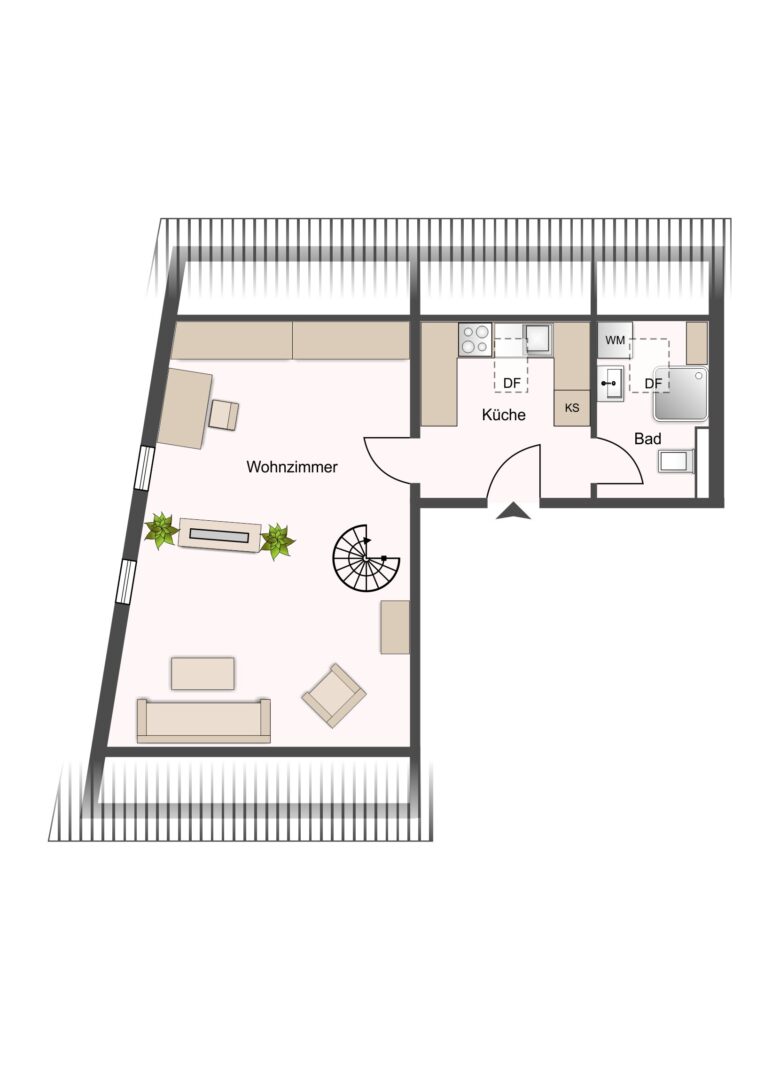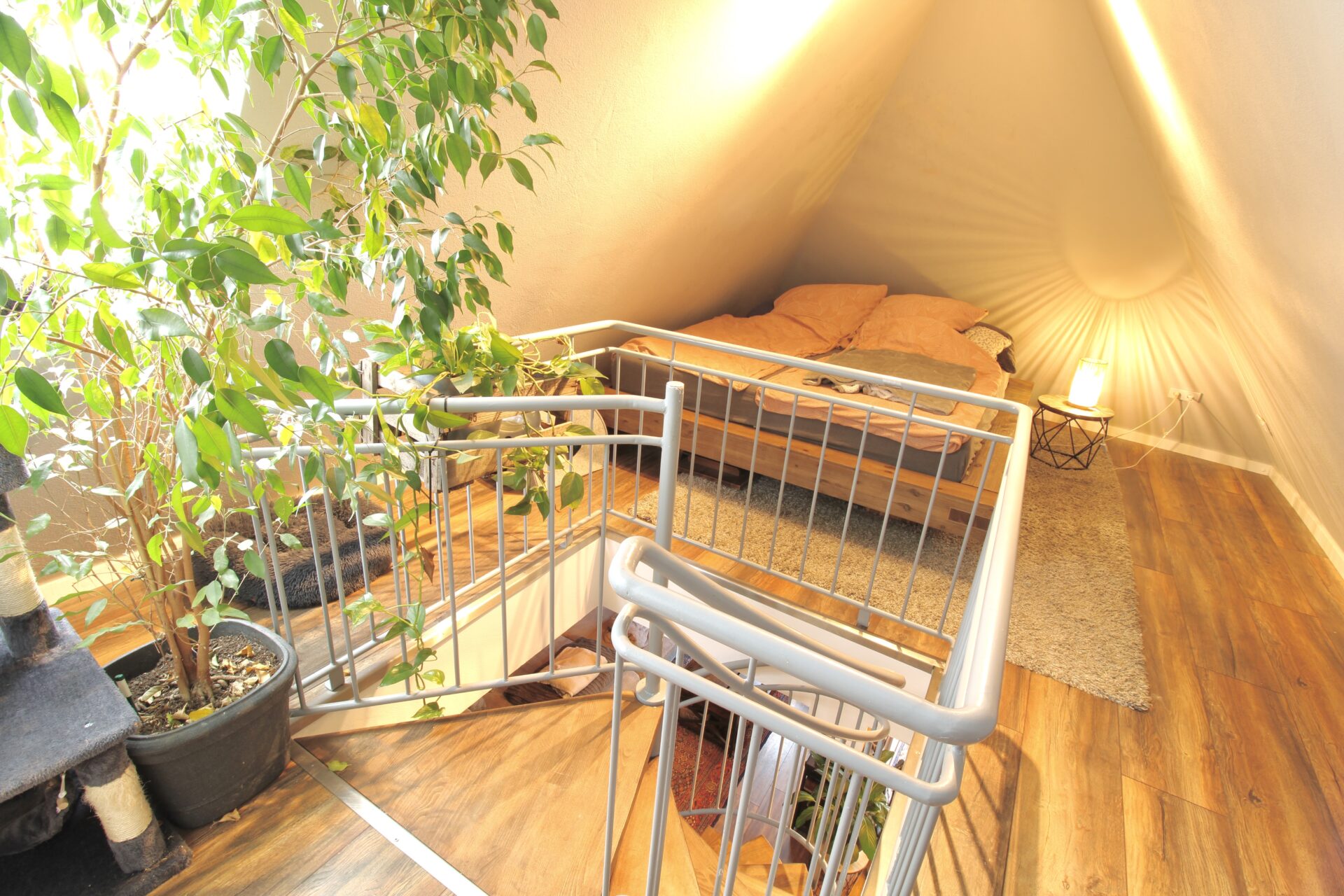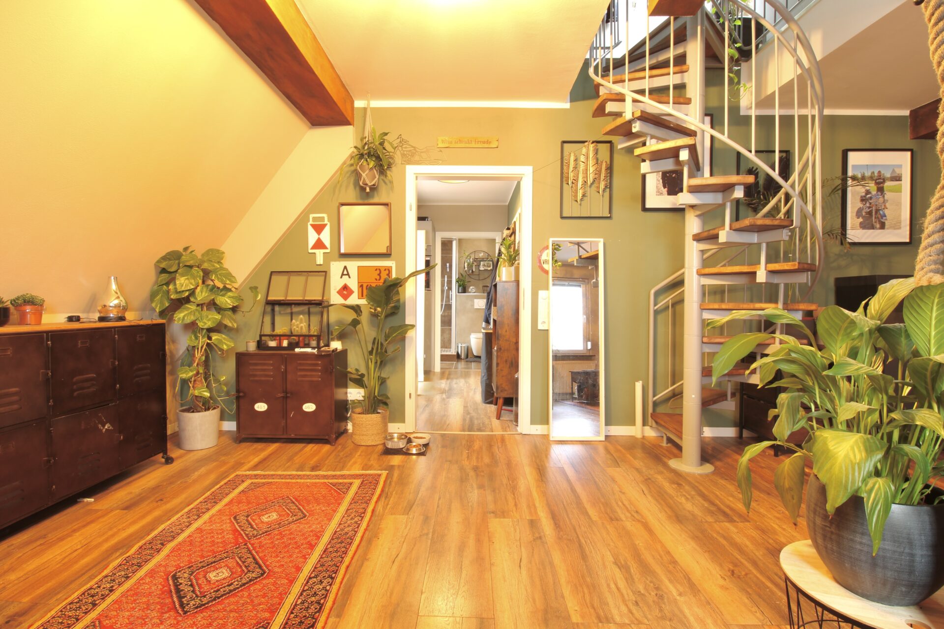 Das großzügige, helle Wohnzimmer bildet das Herzstück der Wohnung und überzeugt durch seine offene Gestaltung und den freundlichen Lichteinfall. Hier lässt sich der Alltag wunderbar mit stilvollem Wohnkomfort verbinden. Von dort führt die moderne Wendeltreppe in das gemütliche Schlafzimmer im Dachgeschoss. Trotz der charmanten Dachschrägen bietet der Raum ausreichend Platz für ein großes Bett sowie einen clever integrierten Einbauschrank, der als Kleiderzimmer genutzt werden kann.